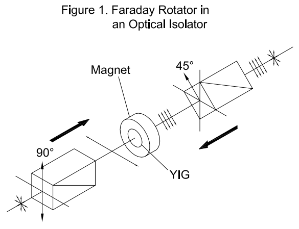 For magneto-optical applications, magnetically saturated YIG rods induce rotation of the polarization plane of transmitted light via the Faraday effect. This rotation is non-reciprocal and exhibits low temperature dependence, making YIG ideal for optical isolators, switches, and multiplexing devices.